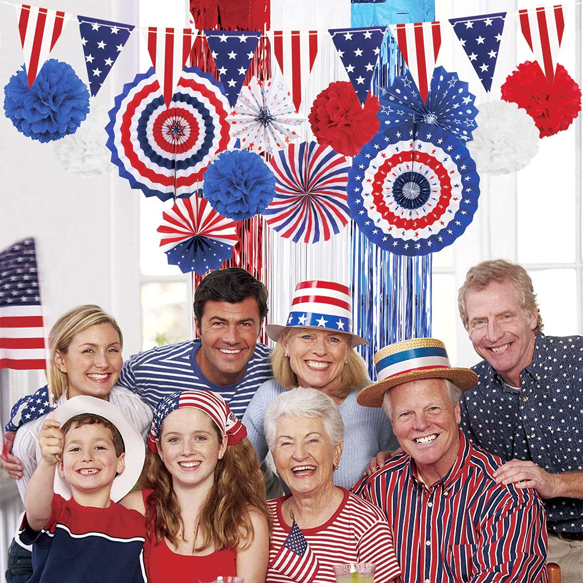 • HANGING ANYWHERE - The paper fans, foil curtain, and star streamer are great to clustered together as a backdrop, hanging from a wall, a tree, a curtain, a door or bedroom . It's also a good idea to turn up the patriotic elements photo booth at your fourth of July BBQ party