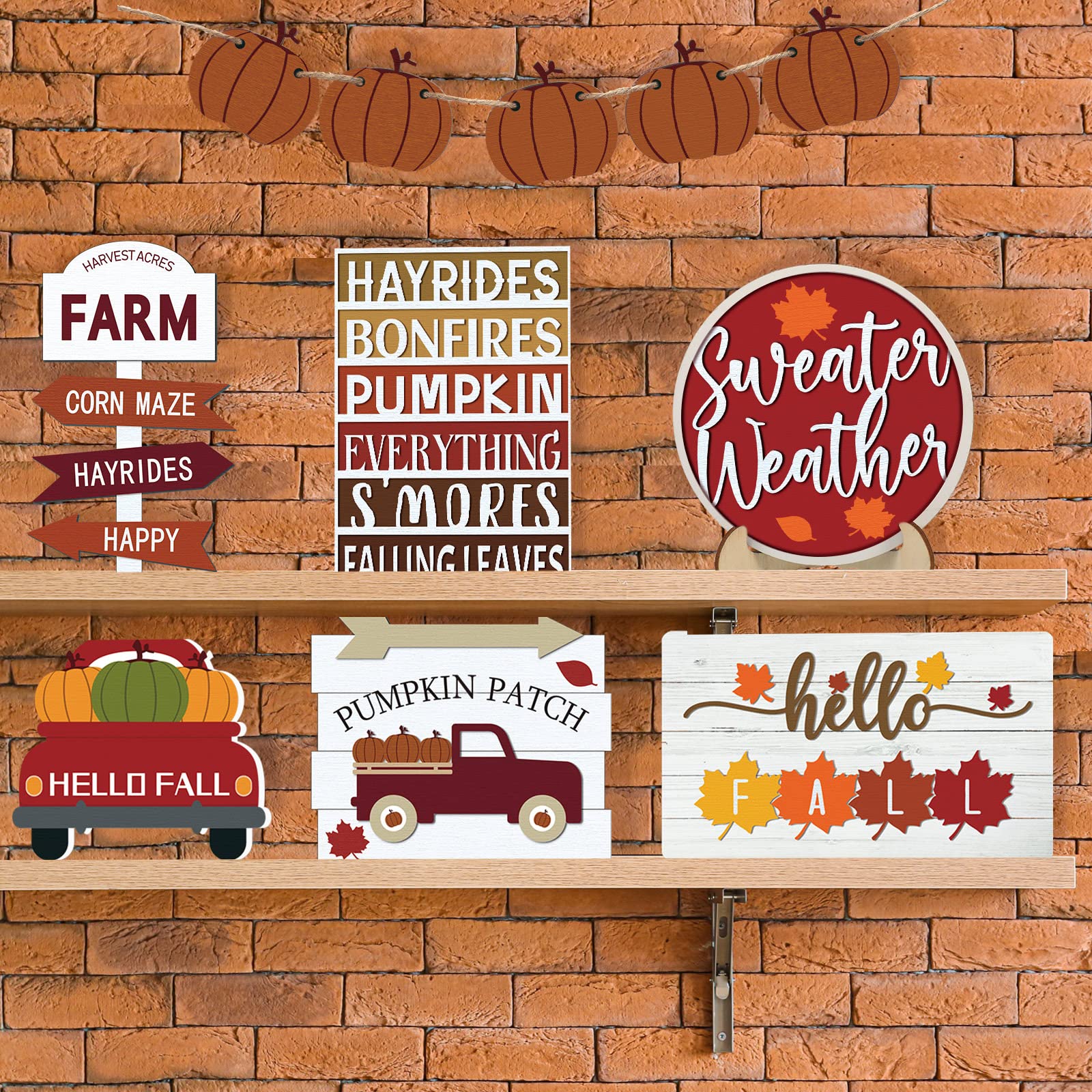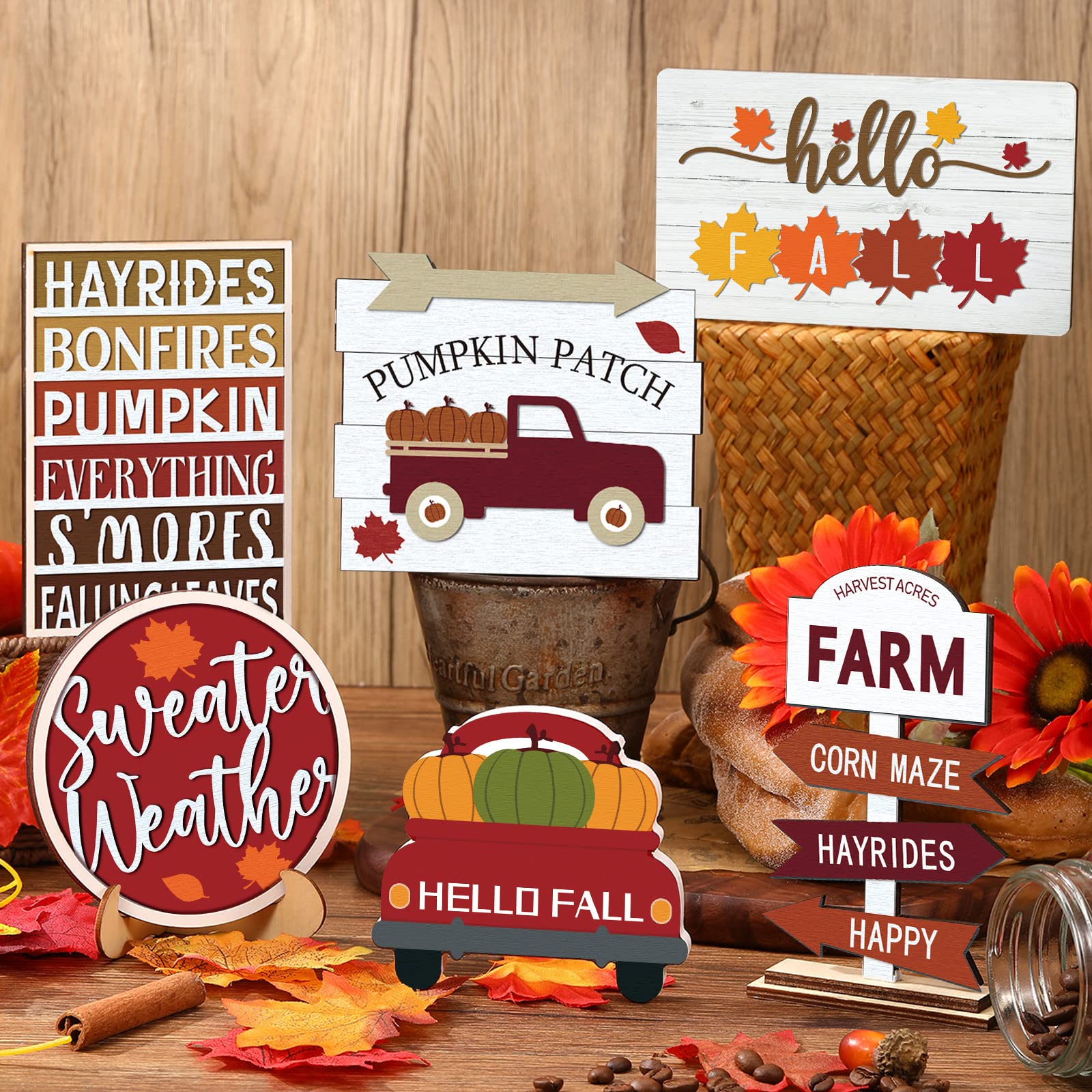 👍Suitable Size: each letter banner is about 6 x 4.4 cm/ 2.36 x 1.73 inches, the gnome wood sign is about 4.7 inches/ 12 cm while the truck wooden sign is about 33 x 51 inches/ 85 x 130 cm; You can check the other fall wooden table signs size on the picture; Each of them is suitable for a tiered tray and can be well matched together