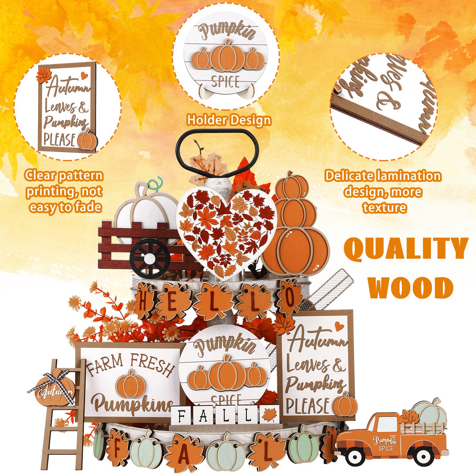 🍁Package Contents: you will get 23 pieces of fall decorations for tiered tray that are nice for your tiered tray display, they contain adorable elements like maple leaf, pumpkin sign, truck, gnome, etc; That add warm atmosphere to autumn; Please note: not include the tray