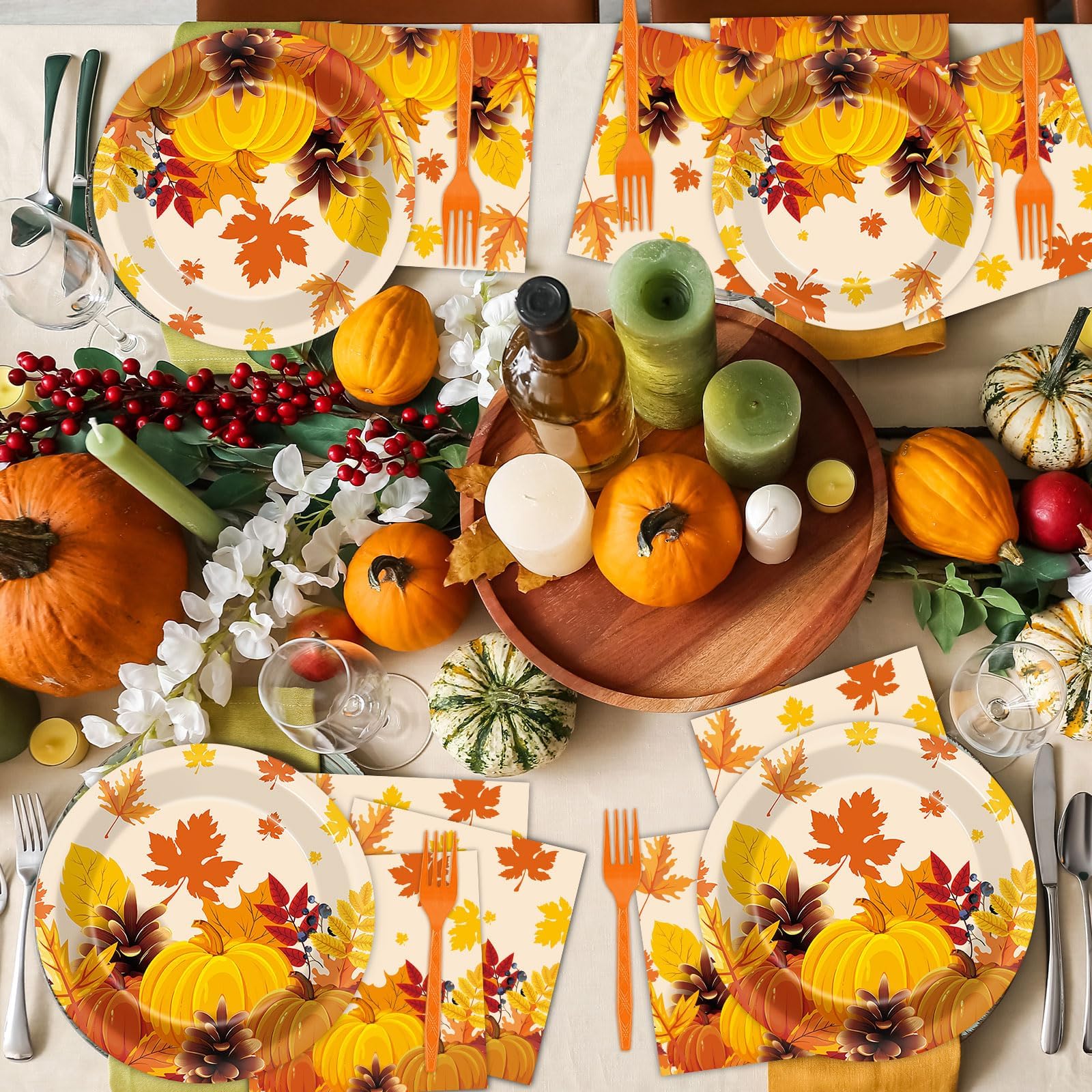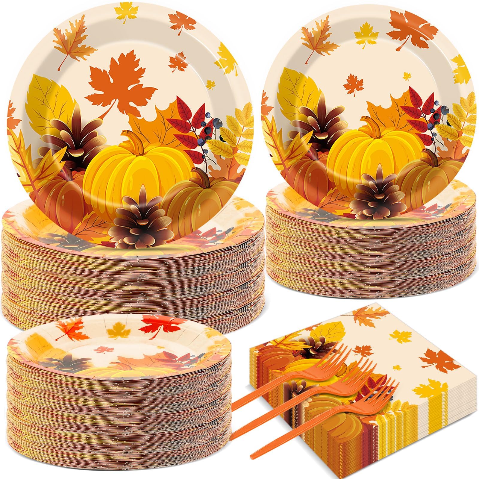 🎃【Package Contents】This thanksgiving fall theme party supplies can serve 50 people, including 50 pieces plate(9"/23cm), 50 pieces plate(7"/18cm),50 pieces napkin(33cm), 50 pieces forks. The fall party favors are enough to decorate your party